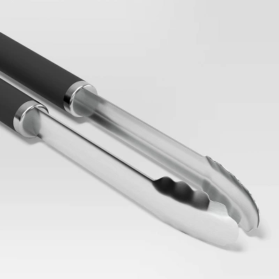 Keep your cookout and grill area well-stocked with the SS Tool Set 3pc from Room Essentials. This 3pc BBQ Tool Set with colored handles includes a spatula, a pair of tongs and a fork. The handles are a cool-touch polypropylene plastic in black. The spatula has a serrated edge for easy and convenient slicing. Wash by hand to keep tools ready for all your barbecues and summer meals.